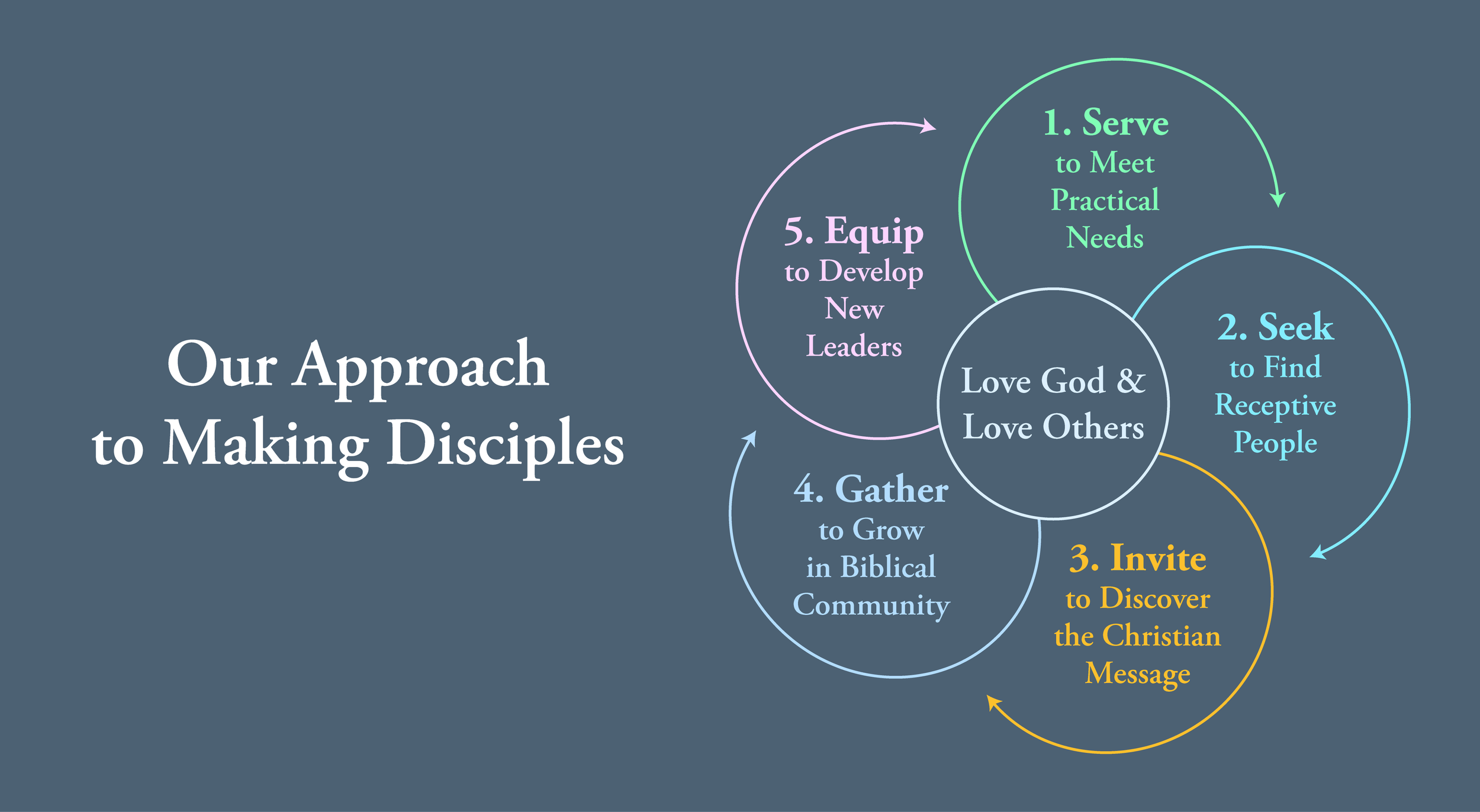 We then reaffirm our trust in Jesus, believing that his death and resurrection are sufficient not only to forgive our sin but to transform our desires. We ask the Father to renew our love for Christ, fill us with the Spirit, and align our lives with what he values most. From that renewed center, the five movements take shape as faithful expressions of love—love that serves, seeks, invites, gathers, and helps others grow.